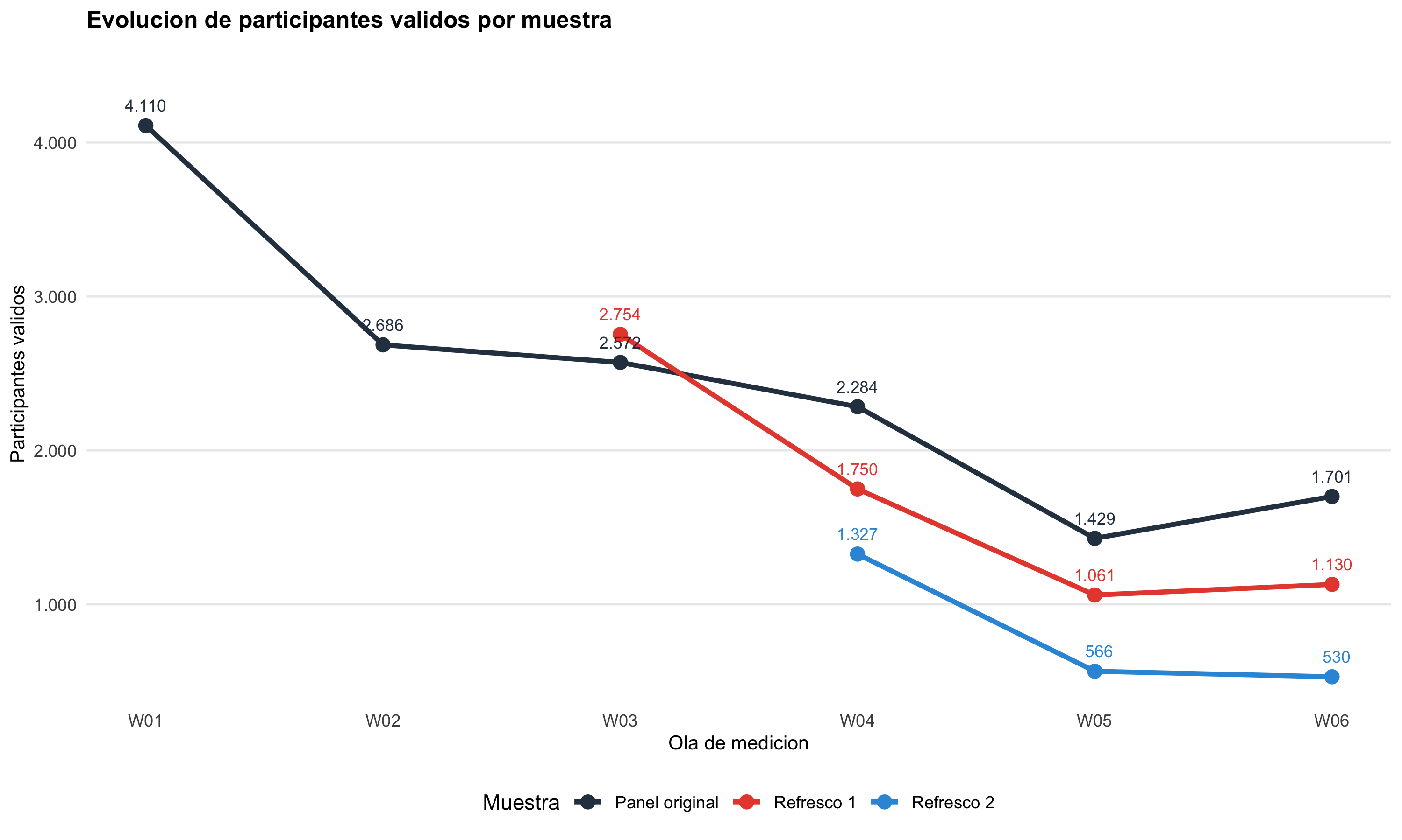 - Los refrescos muestran patrones de atrición similares al panel original en sus primeras olas de seguimiento.