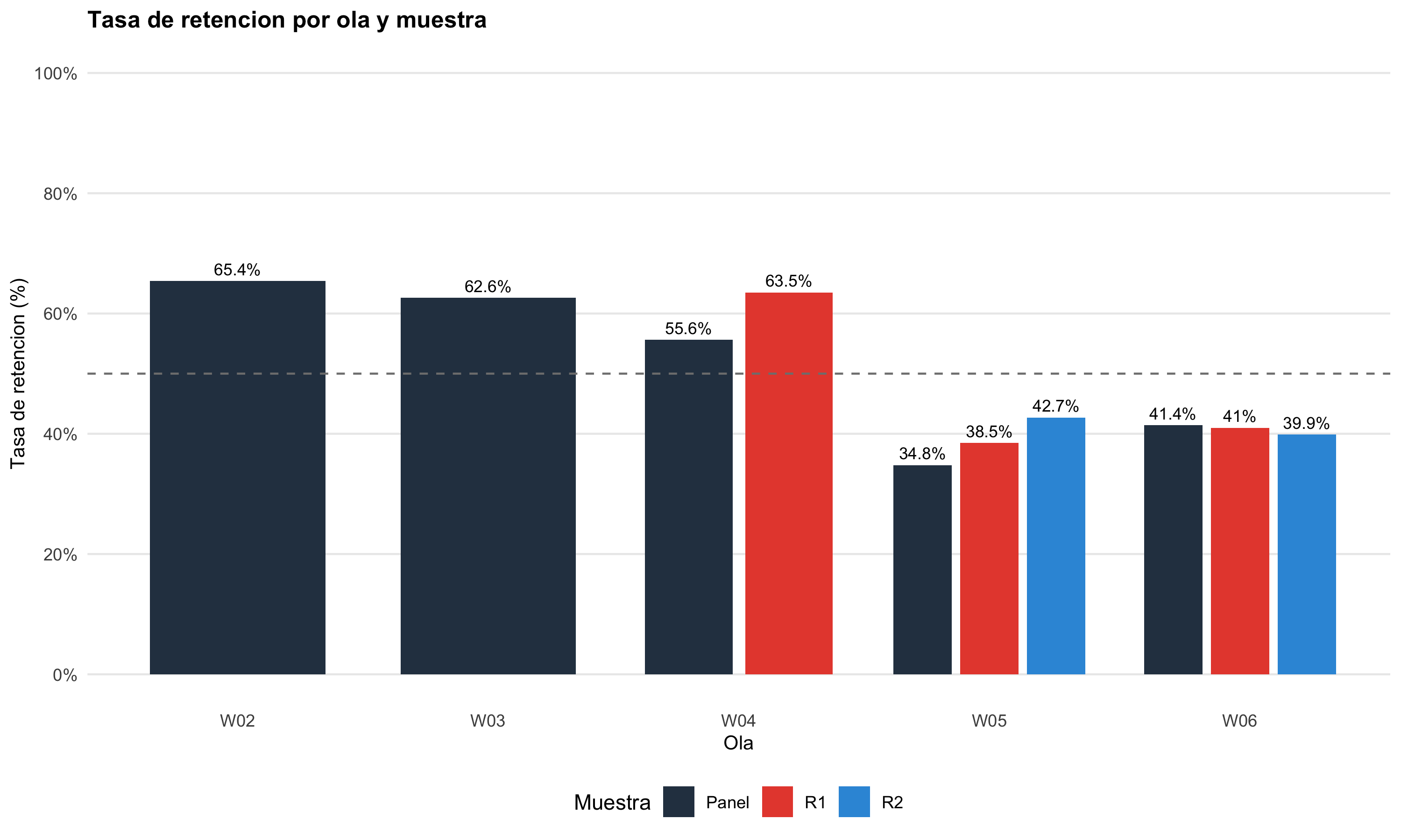 - Tasa de retención: Porcentaje de participantes que responden en una ola respecto a su línea base.